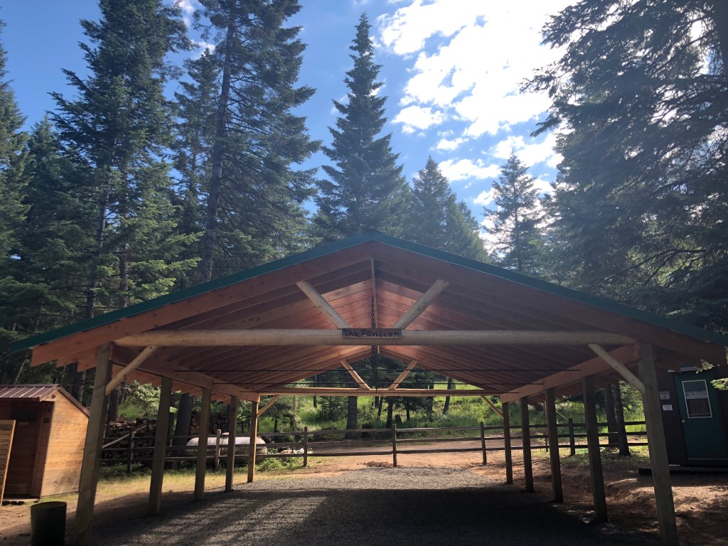 Camp cooking takes place in a well-equipped kitchen including a propane Camp Chef barbecue, stove and two refrigerators. Campers can enjoy their meals in a covered eating area. Washable silverware is provided in an effort to reduce plastic waste.